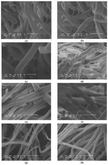 Plant essential oil inhibits the growth of mycelium and causes changes in mycelial morphology. Similar observations were recently presented by Tripathi et al. [42], who found that Hyptis suaveolens essential oil caused severe damage and alterations to the vegetative hyphae of Fusarium oxysporum f. sp. The observations, made with light and electron microscopy, were in accordance with previous studies, in which essential oils of aromatic plants caused morphological alterations in the fungal hyphae [43,44,45]. In our research, SEM observations of C. gloeosporioides hyphae, exposed to essential oils, revealed alterations in the hyphal morphology. Shriveled hyphal aggregates were commonly observed in essential oil-treated mycelium, compared with the thick, elongated, and normal mycelial growth of the controls.