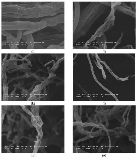 Scanning electron microscopy of the hyphae exposed to three essential oils; (a–c): controls; (d–f): A. annua; (g–i): A. lavandulaefolia; (j–n): A. scoparia.