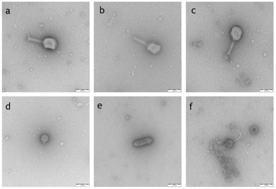 For TEM analysis, phages were treated as previously described []. Briefly, phages were allowed to adsorb onto thin carbon support films. Afterwards, they were negatively stained with 2% (w/v) aqueous uranyl acetate, pH 5.0. Samples were examined in a Zeiss EM-910 or Zeiss Libra120Plus transmission electron microscope (Carl Zeiss, Oberkochen, Germany) at an acceleration voltage of 80/120 kV at calibrated magnifications using a crossed line grating replica. Size determination of heads and tails was performed using the ITEM Software (Olympus Soft Imaging Solutions, Münster, Germany) from at least 3–10 different phage particles and further classification was conducted according to Ackermann [].
