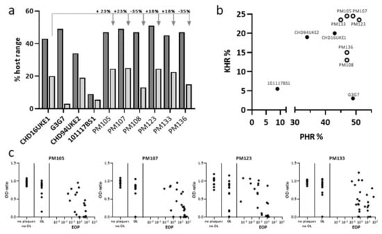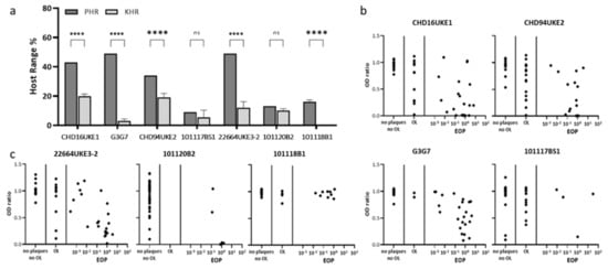 Therefore, the ε2 Myoviridae seem to have acquired the best combination of properties with regards to maximizing both the PHR and KHR. This effect is further visualized in Figure 3b, showing that the bred phages had both a higher KHR and PHR compared to the ancestors. In addition, for these four ε2 Myoviridae phages, we analyzed the correlation between the EOP and OD ratio after 24 h. As depicted in Figure 3c, the correlation of the EOP and OD ratio was still limited, but low OD ratios were reached for more strains compared to the ancestors. This directly results in a higher KHR, as shown in Figure 3a,b.