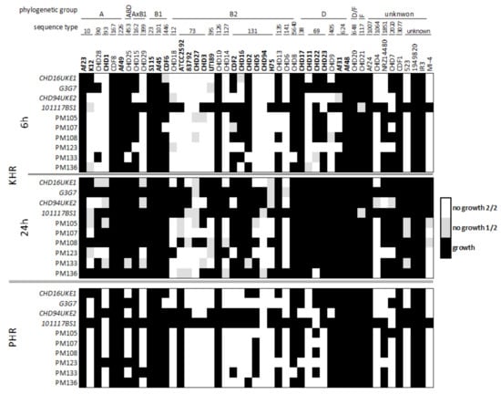 Furthermore, multiple E. coli of the phylogenetic groups A and D, less so B1, were susceptible to the Myoviridae phages. Here, not all representative strains tested of a phylogenetic group or sequence type showed the same susceptibility (Figure 4). Comparison of the kinetic host range data after 6 h and 24 h incubation revealed that the phages could initially inhibit the growth of up to 60% of the bacteria tested, comparable to the plaquing host range. Nevertheless, after 24 h this number dropped distinctly suggesting a putative resistance evolution of the bacteria (Figure 4).