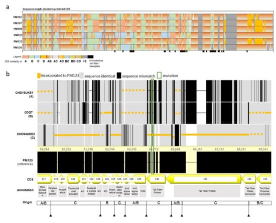 A more detailed analysis of an ~10 kb genomic region (protein coding sequence (CDS) 117 to 133) of phage PM123, one of the phages with improved virulence, revealed at least eight recombination sites (Figure 6), where the PM123 genome switches from one ancestor to another. CDS 117 was identical to the ancestors CHD16UKE1 and G3G7, whereas CDS 118 to 123 were identical to the ancestor CHD94UKE2 and CDS 124 was inherited from the ancestor G3G7 (Figure 6). CDS 130 encodes for a tail fiber protein and was inherited from CHD94UKE2. However, it also contained a mutation (highlighted by a green box in Figure 6b), not presented in any of the ancestors, which translated into an amino acid change (Q166R). This confirms that the breeding process not only promotes recombination, but also allows for the occurrence of spontaneous mutations. Moreover, CDS 131, another tail fiber-encoding gene, was identical to ancestor CHD94UKE2 for the first 2.3 kbp, then switched to ancestors CHD16UKE1 or G3G7 (identical in this stretch) for approximately 400 bp, before switching back to CHD94UKE2 for the last 300 bp (Figure 6).