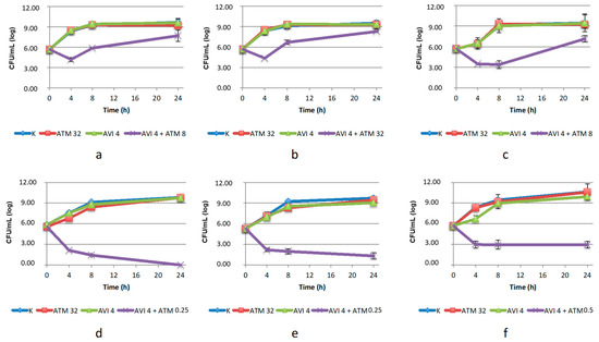 Twenty-four-hour time–kill curves of aztreonam (ATM) and avibactam (AVI), alone and in combination, on: (a) E. coli CP-Ec3; (b) E. coli CP-Ec4; (c) E. coli 482483; (d) C. amalonaticus N18; (e) K. pneumoniae KL 12 SG; (f) K. pneumonia LC954/14. K: positive control (without the addition of antimicrobials). Mean values and standard deviation of three independent experiments are reported.