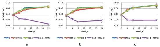 Twenty-four-hour time–kill curves of aztreonam (ATM) and relebactam (REL), alone and in combination, on: (a) C. amalonaticus N18; (b) K. pneumoniae KL 12 SG; (c) K. pneumoniae LC954/14. K: positive control (without the addition of antimicrobials). Mean values and standard deviation of three independent experiments are reported.
