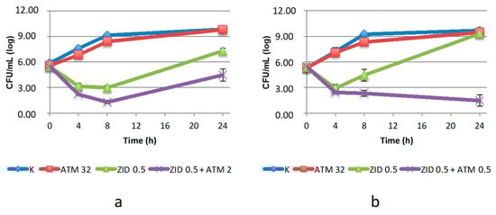 Twenty-four-hour time–kill curves of aztreonam (ATM) and zidebactam (ZID), alone and in combination, on: (a) C. amalonaticus N18; (b) K. pneumoniae KL 12 SG. K: positive control (without the addition of antimicrobials). Mean values and standard deviation of three independent experiments are reported.