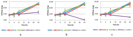 Twenty-four-hour time–kill curves of aztreonam (ATM) and: (a) vaborbactam (VAB); (b) avibactam (AVI); (c) relebactam (REL), alone and in combination, against the S. maltophilia isolate. K: positive control (without the addition of antimicrobials). Mean values and standard deviation of three independent experiments are reported.