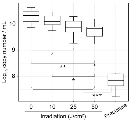 Changes in total bacterial density with increasing violet LED irradiation dose. The total number of bacterial DNA was estimated using universal bacterial 16S rRNA primers for PCR quantification. Statistical significance is indicated by horizontal lines (* p < 0.05, ** p < 0.001, *** p < 0.0001, Wilcoxon rank-sum test).