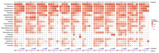 Heatmap illustrating the 20 most abundant bacterial genera after violet LED irradiation and subsequent in vitro cultivation. Values shown in each cell indicate the relative abundance as a percentage, according to sequencing of the V3–V4 region of 16S rRNA gene amplicons. Colors represent the frequency on a log10 scale. The columns are shown in order from left to right for each subject: preculture, 0, 10, 25, 50 J/cm2 after incubation.