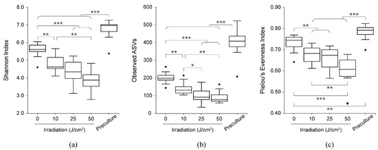 Comparisons of alpha diversity of precultured and irradiated samples at each dose. Boxplots of alpha diversity indices are displayed by (a) Shannon index, (b) observed ASVs, and (c) Pielou’s evenness index (* p < 0.05, ** p < 0.01, *** p < 0.001, Kruskal–Wallis test).