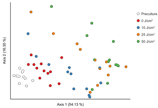 According to the Shannon index, observed ASVs, and Pielou’s evenness index, the alpha (intrasample) diversity of the community decreased significantly with violet LED irradiation dose (Figure 3a–c). A further comparison of samples cultured on SHI medium with and without irradiation revealed significant differences in the Shannon index, observed ASVs, and Pielou’s evenness index. Beta (intercommunity) diversity was altered in accordance with the violet LED irradiation dose (Figure 4 and Figure S3). The five communities showed a relatively significant separation in the plot based on principal coordinate analysis. We then performed linear discriminant analysis effect size to assess the differences in bacterial distribution. At the taxonomic level of family, a significant decrease in the relative ratio of Fusobacteriaceae was observed with violet LED irradiation of 10 J/cm2, whereas an increase in the relative ratio of Veillonellaceae was found with irradiation of 50 J/cm2 (Figure 5).