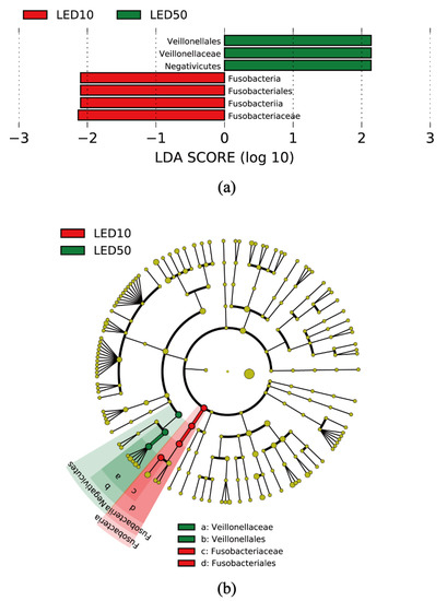 Linear discriminant analysis effect size identification of the most differentially abundant taxa between plaque microbiotas with 10 J/cm2 and 50 J/cm2 of violet LED irradiation. (a) Histogram of linear discriminant analysis scores (log10) computed for features with differential abundance in samples exposed to 10 J/cm2 and 50 J/cm2 of violet LED irradiation (red, 10 J/cm2; green, 50 J/cm2). (b) Taxonomic representation of statistically and biologically consistent differences in samples exposed to 10 J/cm2 and 50 J/cm2 of violet LED irradiation. Each filled circle represents a phylotype. The name of phylum and class are indicated on the cladogram, with the order or family given in the panel below. The diameter of each circle is proportional to the taxon abundance.