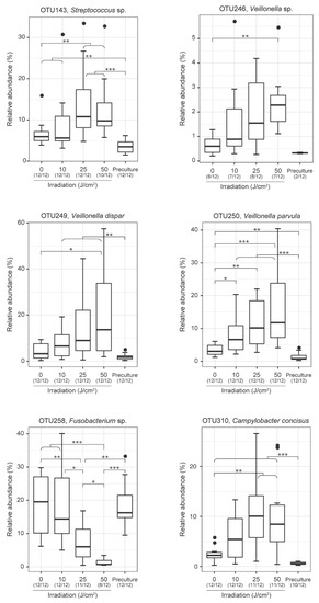 Relative abundance of the six representative operational taxonomic units (OTUs) altered by violet LED irradiation (* p < 0.05, ** p < 0.01, *** p < 0.001, Wilcoxon rank-sum test).