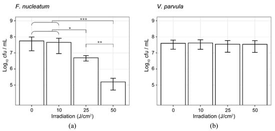 Effect of violet LED irradiation on the bacterial cell viability. (a) Bacterial viability of F. nucleatum subsp. polymorphum at different violet LED irradiation doses. Each value is calculated from quadruplicate assays, presented as the mean ± standard deviation. (b) Bacterial viability of V. parvula at different violet LED irradiation doses. Each value is calculated from quintuplicate assays, presented as the mean ± standard deviation (* p < 0.05, ** p < 0.01, *** p < 0.001, Student’s t-test).