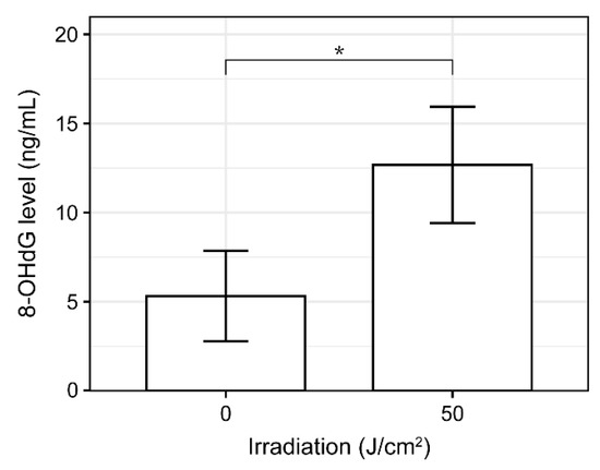Here, we investigated whether DNA oxidation occurred in F. nucleatum subsp. polymorphum upon violet LED irradiation. DNA was extracted from F. nucleatum irradiated with violet LED light, and the accumulation of 8-hydroxy-2-deoxyguanosine (8-OHdG) damage in DNA was analyzed by enzyme-linked immunosorbent assay (ELISA). The DNA of F. nucleatum subsp. polymorphum irradiated with 50 J/cm2 of violet LED light manifested a significantly higher ratio of 8-OHdG than the nonirradiated group, indicating that DNA was oxidatively damaged by LED irradiation (Figure 8).