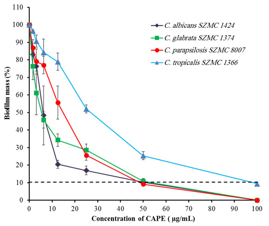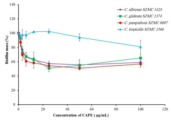 The effect of CAPE on the mature biofilms of four biofilm-forming Candida species was investigated. Treatment of the mature biofilms of C. albicans SZMC 1424, C. glabrata SZMC 1374, C. tropicalis SZMC 1366, and C. parapsilosis SZMC 8007 with different concentrations of CAPE caused a partial eradication. The maximum eradications (19–49%) for the mature biofilms of C. glabrata SZMC 1374, C. albicans SZMC 1424, and C. parapsilosis SZMC 8007 were achieved at 25, 50, and 50 µg/mL, respectively. Moreover, the eradication process was found to be dose-independent above 50 µg/mL in the case of these strains. On the other hand, the mature biofilms of C. tropicalis SZMC 1366 were the most resistant to CAPE, and the maximum eradication was achieved at 100 µg/mL (Figure 2).