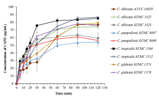 Biosorption may be defined as “the removal/binding of desired substances from aqueous solution by biological material” []. The results revealed that the biosorption of CAPE by different Candida strains occurs rapidly, followed by a maximum biosorption observed within the first 30 to 90 min (Figure 3). According to the amount of CAPE biosorbed, two groups can be recognized: the first group was able to biosorb 53–63 µg/mL of CAPE, and it includes C. albicans SZMC 1424, C. parapsilosis SZMC 8007, and C. parapsilosis SZMC 8008; in contrast, the second group was able to biosorb 74–86 µg/mL, and it includes C. albicans ATCC 44829, C. albicans SZMC 1423, C. tropicalis SZMC 1366, C. tropicalis SZMC 1512, C. glabrata SZMC 1374, and C. glabrata SZMC 1378.