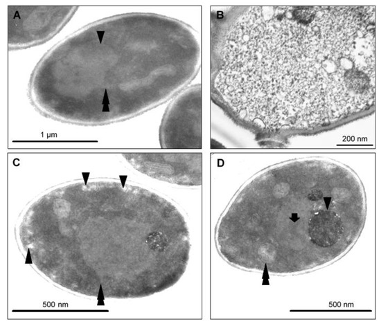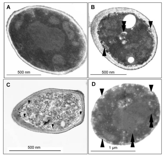 (A) TEM micrographs of the control Candida tropicalis SZMC 1366 cell structure demonstrates intact membranes, small unevenly scattered condensed chromatin grains, and homogenous cytoplasm structure. (B–D) TEM micrographs of C. tropicalis treated with a sub-lethal concentration of CAPE: (B) Late-stage disintegration with membrane fingerprints, vacuolization, plasma membrane detachment (arrowheads), and vacuole formation (double arrowheads). Fine granular homogenous cytoplasm organization disappeared, and a dense, compact cytoplasm with signs of fragmentation, rounded cell shape, and whole-cell shrinkage was seen. (C) Necrotic cell with membrane ruptures (arrowheads) and loss of cytoplasm density. (D) Several peripheral vacuoles show plasma membrane involvement (arrowheads). Nuclear bleb formation (double arrowheads).