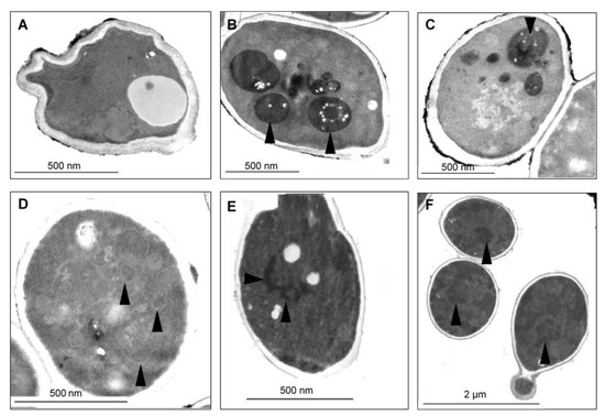 TEM micrographs of C. albicans SZMC 1423 treated with a sub-lethal concentration of CAPE exhibit different markers of cellular deterioration. (A) Severe cell wall distortion. (B,C) Appearance of enlarged lysosomes was rather frequently detected (arrowheads). (D) Isolation membranes precondition of cytoplasm fragmentation (arrowheads). (E,F) Nucleus fragmentation and marginal condensation (arrowheads).