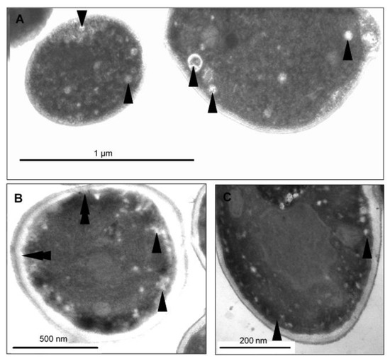 To visualize the changes in intracellular morphology of the cells after CAPE treatment, transmission electron microscopy imaging was performed on Candida cells exposed to sub-lethal concentrations of CAPE. The TEM micrographs of C. tropicalis SZMC 1366, C. albicans SZMC 1423, and C. parapsilosis SZMC 8007 (Figure 6, Figure 7 and Figure 8, respectively) mainly revealed typical hallmarks of apoptosis, including nuclear chromatin margination, nuclear blebs, condensation in the nucleus, vacuolization, plasma membrane detachment, enlarged lysosomes, cytoplasm fragmentation, cell wall distortion, and whole-cell shrinkage. However, very few cells displayed signs of necrosis, such as membrane disintegration and loss of cytoplasm density, whereas the TEM micrographs of C. glabrata SZMC 1374 (Figure 9) mainly revealed smaller necrotic signs.