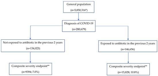 The variables assessed in each cohort during follow-up were the diagnosis of pneumonia, hospital admission and mortality—all related to COVID-19 infection. The primary outcome was a composite endpoint of severity composed by pneumonia, hospitalization and/or death due to COVID-19. The risk of these events was analyzed comparing patients exposed to antibiotics with those non-exposed and according to the level of exposure to antibiotics: high vs. low exposure, recent vs. old exposure and exposure to HPCIAs vs. other antibiotics. We assumed that in individuals with no record of any of the variables of interest, there were no existing severity endpoints, health problems, drug exposure or smoking habits.