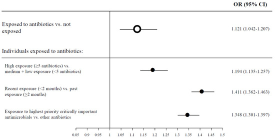 A total of 25,222 patients presented the primary composite outcome of death, hospitalization and/or pneumonia related to COVID-19 infection (9% of the patients). This percentage of disease severity was significantly higher among patients exposed to antibiotics (n: 15,828, 10.8%) compared to patients not exposed (n: 9394, 7%) (Figure 1). In the multivariable analysis, we found a significant correlation between previous antibiotic exposure and the composite severity endpoint (OR 1.12; 95% CI: 1.04–1.21) (Table 2). High antibiotic exposure (five or more antibiotic regimens) was associated with an OR of severity of 1.19 (95% CI: 1.14–1.26) compared to medium + low antibiotic regimens. Patients with recent antibiotic exposure (<2 months) had a higher risk of COVID-19 severity than patients with past antibiotic exposure (OR 1.41; 95% CI: 1.36–1.46). Patients with past antibiotic exposure (≥2 months) had no increased risk of COVID-19 severity. Patients exposed to HPCIA had a significantly higher risk of COVID-19 severity than patients exposed to other antibiotics (OR, 1.35; 95% CI: 1.30–1.40). Among individuals who were exposed to antibiotics, those who presented the most severe cases of COVID-19 infection were the patients exposed to quinolones (OR, 1.49; 95% CI: 1.42–1.56) and cephalosporins (OR, 1.45; 95% CI: 1.36–1.55) (Supplementary Table S2). Figure 2 shows adjusted ORs of the correlation between different antibiotic exposures and the composite severity endpoint of COVID-19.
