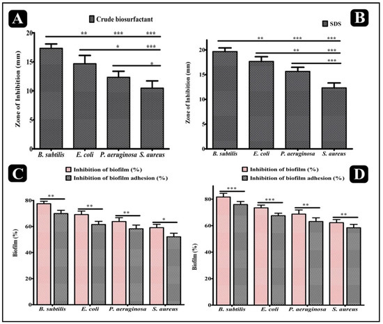 Results of the antibacterial and antibiofilm activity of P. pentosaceus crude biosurfactant and standard SDS. (A) Antibacterial activity of P. pentosaceus crude biosurfactant (100 mg/mL) against different bacterial pathogens. (B) Antibacterial activity of standard SDS surfactant (1% v/v) against different bacterial pathogens. (C) Effect of P. pentosaceus crude biosurfactant on established biofilms and on adherence ability of different bacterial pathogens at respective MICs. (D) Effect of the standard SDS surfactant on the established biofilms and on the adherence ability of different bacterial pathogens at respective MICs. Values are represented as the mean ± SD of three independent experiments. Significance; ns > 0.05, * p < 0.05, ** p < 0.005, *** p < 0.0005.