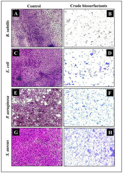Recently, microbial surfactants, commonly known as ‘biosurfactants’, have caught the attention of scientists due to their environmentally-friendly nature, easy bulk production, effectiveness under harsh environmental conditions, selectivity, diversity, and potential applications in different fields. Biosurfactants are amphiphilic substances commonly synthesized by different microbes on their surface or as extracellular secretion, which efficiently reduces the surface tension and represent emulsifying activities [10]. Biosurfactants are surface-active compounds that consist of protein–polysaccharide complexes, glycolipids, phospholipids, neutral lipids, fatty acids, rhamnolipids, and lipopeptides [11]. Various biosurfactants have displayed antimicrobial and anti-adhesive properties, leading them as suitable candidates to combat a variety of infections and biofilms caused by diverse microorganisms [12].