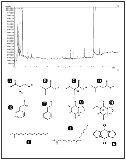 GC-MS analysis of crude biosurfactant derived from P. pentosaceus. Identified compounds. (A) Glyceraldehyde, (B) Propanoic acid, 2-methyl-, (C) Butanoic acid, 2-methyl-, (D) Pentanoic acid, 4-methyl-, (E) Benzeneacetaldehyde, (F) Phenylethyl Alcohol, (G) (Cyclo(-d-Ala-L-Pro)), (H) (Cyclo(-Pro-Val)), (I) n-Hexadecanoic acid, (J) Oleic Acid, and (K) Octahydro-5H, 10H-dipyrrolo [1,2-a:1′,2′-d]pyrazine-5,10-dione.