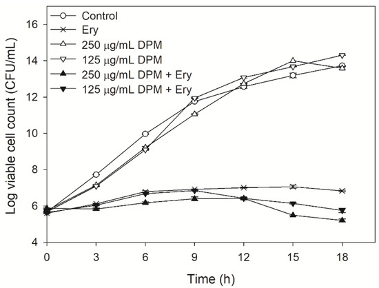 The time-kill experiments were performed according to the method described by Felicetti, et al. [49], with some modifications. Conical flasks with a volume of 50 mL, containing 20 mL E. coli Kam3/pSYC-acrB cells (5 Log CFU/mL), were added with erythromycin alone (250 μg/mL), DPM (125 and 250 μg/mL) or erythromycin and DPM, and the cell counts were monitored every 3 h over a period of 18 h by using plate counts. Each analysis was performed in triplicate.