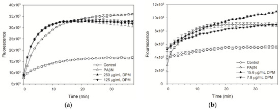 The dyes H33342 and EtBr were used to monitor the accumulated fluorescence in E. coli Kam3-AcrB. The RND (Resistance-Nodulation-Division) pump inhibitor PAβN was used as the positive control [36]. As indicated in Figure 2a, DPM at both 250 µg/mL and 125 µg/mL could increase the accumulation of H33342 in Kam3-AcrB, thus providing indirect evidence that DPM interferes with the efflux of H33342 by Kam3-AcrB. Similar results are indicated in Figure 2b, which demonstrates that DPM at 15.6 µg/mL and 7.8 µg/mL could dose-dependently increase the EtBr accumulation in Kam3-AcrB. Mouwakeh et al. [37] evaluated the phytochemical components of black cumin (Nigella sativa), such as thymoquinone, carvacrol, and p-cymene, for efflux pump inhibition activity and showed that all three compounds could increase EtBr (Ethidium bromide) fluorescence accumulation in methicillin-resistant S. aureus, thus demonstrating their application as bacterial-resistance modifiers. The dye accumulation data indicated that DPM possesses the potential to act as an EPI against E. coli Kam3-AcrB.