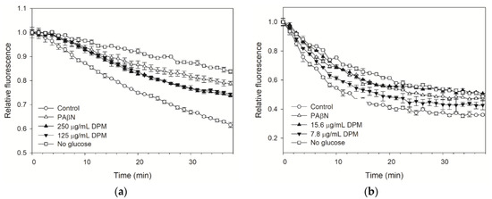 A dye efflux assay can be used to evaluate the activity of EPIs, providing direct evidence of whether the pump efflux has been interfered with in the presence of EPI [38]. To further evaluate the potential of DPM as an EPI against E. coli Kam3-AcrB, H33342 and EtBr efflux in Kam3-AcrB in the presence of DPM was monitored. As indicated in Figure 3a, Kam3-AcrB (control) could reduce H33342 fluorescence to 0.61 in 38 min, indicating the efflux of H33342 from the cells. The Kam3-AcrB without additional glucose energization featured an H33342 fluorescence of 0.84 in 38 min, which was higher than the control group. The addition of PAβN and DPM (250 µg/mL and 125 µg/mL) could slow the decrease in H33342 fluorescence, suggesting that these compounds could interfere with the H33342 efflux from the cells. Similar results can be seen in Figure 3b, which displays the results of the monitoring of the efflux of EtBr in the presence of DPM. The addition of PAβN and DPM (15.6 µg/mL and 7.8 µg/mL) could slow the decrease in EtBr fluorescence, suggesting their interference with EtBr efflux from the cells. The results of the dye efflux assays were consistent with the data from the dye accumulation assays, indicating that DPM could interfere with the efflux of H33342 and EtBr, therefore suggesting its EPI potential.