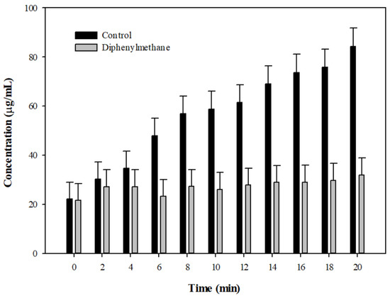 The (a) H33342 and (b) EtBr efflux assay with diphenylmethane in E. coli Kam3-AcrB. Dye was added to the drug-resistant E. coli cells, which were energized with glucose in the presence of DPM. H33342 (3 µM), EtBr (3 µM), glucose (25 mM), PAβN (20 µg/mL), and DPM. Data are expressed as mean ± SD (n = 3).