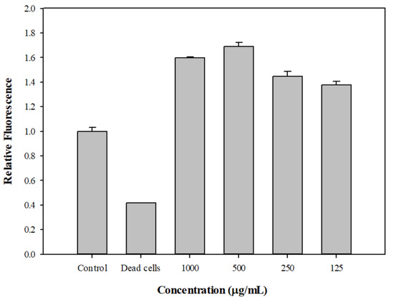 A human hepatic HepG2 cell line was maintained according to the instructions of the Bioresource Collection and Research Center (BCRC; Hsinchu City, Taiwan), and supplemented with 50 units/mL penicillin G and 50 µg/mL streptomycin sulfate. All of the reagents for the cell culture were obtained from Gibco/Thermo Fisher Scientific Inc. (Bethesda, MD, USA). The cytotoxicity of DPM on HepG2 cells was estimated through a trypan blue exclusion assay. Approximately 4 × 104 cells were seeded in a 12-well culture plate, and then incubated overnight. The DPM was solved in ethanol, and then added to the culture medium at final concentrations of 0, 15.6, 31.3, 62.5, 125, and 250 µg/mL. The cells were incubated for 24 h before the cell viability assay.
