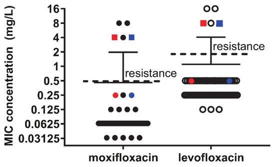 Furthermore, prolonged incubation of these two isolates with levofloxacin resulted in spontaneous induction of resistance (MIC 4 or 8 mg/L for moxifloxacin and levofloxacin, respectively; Figure 2) within 24–48 h later, which was not observed for other isolates. Resequencing of these induced resistant isolates (given names, DF282R and S019M2R) and found induction of the same parC mutation as observed for MH10-9 S91I (S81I E. coli numbering; Figure 1). While the gyrA SNP of MH10-09 was observed to be shifted 12 bases downstream relative to the QRDR mutations present in other isolates, no significant difference in MICs were detected between these three isolates. It is interesting to note that while S019M and DF28 shared the observed gyrA mutation with MH15-3 and U006, the induced parC mutation aligned with that observed for MH10-9 (Appendix A, Table A1, Table A3, Table A4 and Table A5). Further, U006 additionally contained an K144R mutation proposed as a source of fluoroquinolone resistance in a previous report [12], but this polymorphism can be observed in 28 other isolates (Appendix A, Table A3, Table A4 and Table A5) without elevated MICs in this cohort and, therefore, is clearly a non-resistance polymorphism and not a resistance-mediating mutation. With regard to parC QRDR mutations, this appears to be the dominant determinant for levofloxacin and moxifloxacin resistance as only those strains carrying either S91I (E. coli numbering S81I) or E95K or V (E. coli numbering E85K or V) were phenotypically resistant. The gyrA mutation S153L is only capable of mediating an intermediate moxifloxacin MIC = 0.25 mg/L when present alone (Figure 2).