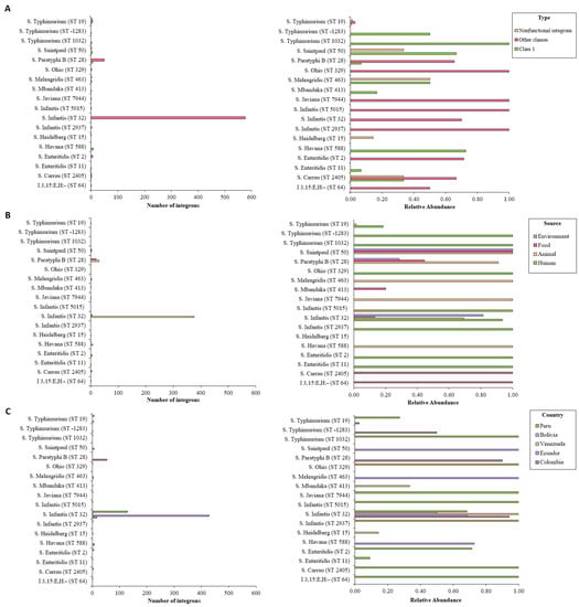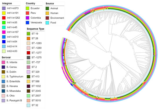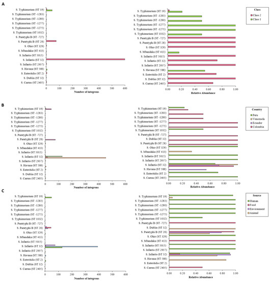 Torres-Elizalde, L.; Ortega-Paredes, D.; Loaiza, K.; Fernández-Moreira, E.; Larrea-Álvarez, M. In Silico Detection of Antimicrobial Resistance Integrons in Salmonella enterica Isolates from Countries of the Andean Community. Antibiotics 2021, 10, 1388. https://doi.org/10.3390/antibiotics10111388