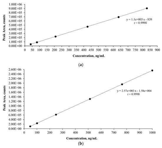 Figure 1 shows the calibration curve of AMX, ranging from 40 to 800 ng mL−1, and the calibration curve of CIP, ranging from 50 to 1000 ng mL−1. The calibration curves obtained between the average peak and concentration showed a linear relationship with a correlation coefficient of 0.9998 for both antibiotics, so the LC/MS method was found to be highly selective and reproducible.