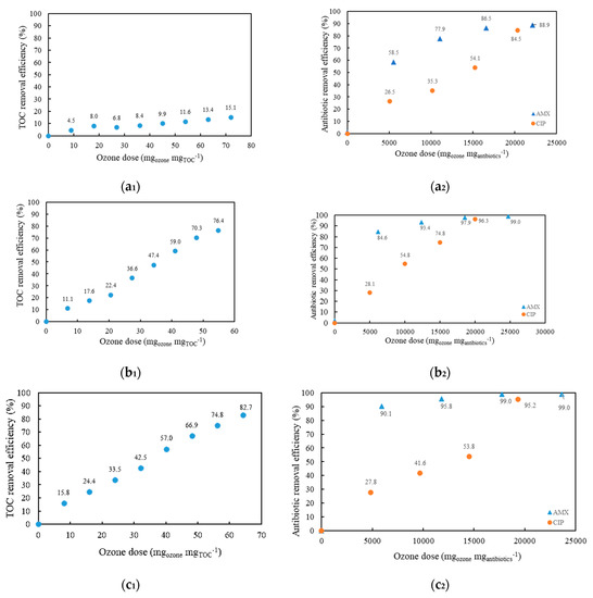The effectiveness of AMX and CIP ozonation was evaluated considering the influence of two variables: pH and the addition of hydrogen peroxide. Figure 2a1,b1,c1 shows the TOC removal efficiency for model wastewater with AMX and CIP. It can be seen that alkaline conditions (Figure 2b1) showed a higher removal efficiency compared to acidic conditions (Figure 2a1). The TOC removal efficiency was five times more efficient. As shown in Figure 2a2,b2,c2, ozonation was effective in removing AMX and CIP from the model wastewater. For both CIP and AMX, degradation was most pronounced under alkaline conditions (pH = 10.85), with the combined O3/H2O2 process achieving 99% removal efficiency for AMX and 95% for CIP. Regardless of the process conditions, the total concentration of CIP (Figure 2a2,b2) remained constant in all cases during the first 30 min (5000 mgozone mgantibiotics−1), and then removal efficiency increased to 35.3–54.8% at an ozonation time of 60 min (10,000 mgozone mgantibiotics−1), while the concentration of AMX increased to 78% at 60 min (11,059 mgozone mgantibiotics−1) in acidic conditions and to 85% at 30 min (6179 mgozone mgantibiotics−1) in alkaline conditions.