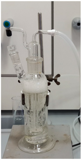 The main experiment was set up to study the effect of ozone dosage on treatment performance. Ozone was generated from pure oxygen used as feed gas (>99.5 vol.%, Messer, Bad Soden, Germany) and was introduced at the bottom of the glass bubble column reactor (250 mL) (Figure 6) through a gas distributor using the Wedeco ozone generator (Xylem Water Solutions Herford GmbH, type OCS Modular 8 HC, Herford, Germany). The O3 generator used had a production capacity of 8 g h−1, with the possibility to control the gas flow at QG = 10–100 NL h−1 and to adjust the ozone concentration in the produced gas to 10–100 g Nm−3. All gas phase flows (Nm−3, NL) were measured with scales of normal temperature (0 °C, 273 K) and pressure (100 kPa) conditions.