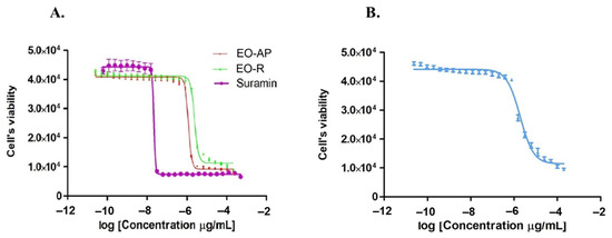 Growth inhibition of T. brucei s427 cells by A. nemorosa EO from aerial parts (EO-AP) and roots (EO-R) and by farnesene. (A). Growth inhibition of T. brucei treated with EO-AP (red curve) and EO-R (green curve) with Suramin as control (purple curve). (B). T. brucei growth inhibition with farnesene.