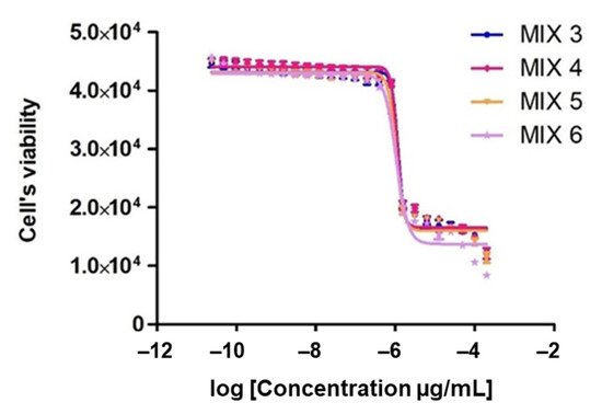 Tests of combinations of EO constituents against T. brucei. The different mixes are described in Table 3 and the curves are colored according to the following scheme: Mix 3 (blue curve), Mix 4 (red curve), Mix 5 (orange curve), and Mix 6 (purple curve). Each EC50 value represents the mean of four independent experiments with standard errors.