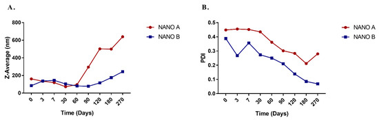 The obtained nanoemulsified systems were assessed by the absence of visible oily droplets through optical microscopy. The droplet size distributions of nanoemulsions were centered between 140 and 170 nm (mean diameter, Z-average) up to two months from the preparation for NANO A and up to four months for NANO B. At a longer storage time, both nanoemulsions showed an increase in the mean droplet diameter, which was more pronounced for NANO A than NANO B. Indeed, the mean droplet diameter reached approximately 700 nm for NANO A (after 9 months from the preparation), while it was below 300 nm for NANO B (Figure 4A). Besides, the polydispersity Index (PDI) values were lower for NANO B than NANO A (Figure 4B). PDI is an indicator (ranging from 0 to 1) of the width of the distribution (a smaller index indicates a monodispersed system) [19]. Overall, these results highlight the role of ethyl oleate as co-solvent in the formulation, since it has improved the particle size and stability of nanoemulsions.