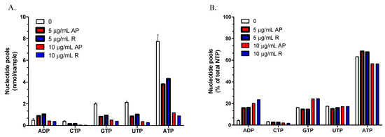 Effect of A. nemorosa EOs on T. brucei nucleotide pools. (A). Levels in nmol per sample of nucleoside triphosphates (NTPs) and ADP when T. brucei cells are treated with different concentrations of EOs from A. nemorosa aerial parts (AP) and roots (R); (B). Same data as in A, but the nucleotides are replotted as a percentage of the total NTP pool.