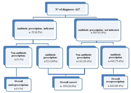 Appropriateness of antimicrobial prescription patterns was assessed according to international guidelines [15,16,17]. In particular, antimicrobial treatment is indicated: (1) for acute rhinosinusitis, in presence of severe (>3–4 days) symptoms (fever ≥ 39 °C/102 °F and purulent nasal discharge or facial pain); persistent (>10 days) symptoms (nasal discharge or daytime cough) without improvement, or worsening (3–4 days) symptoms (worsening or new onset fever, daytime cough, or nasal discharge after initial improvement of a viral upper respiratory infections lasting 5–6 days); (2) for pharyngitis, only in presence of Group A beta-hemolytic streptococcal (GAS) infection; (3) for acute bronchitis, only for patients with acute bacterial exacerbation of chronic bronchitis and Chronic Obstructive Pulmonary Disease (COPD); (4) for common cold, and influenza, antimicrobial treatment is never indicated; (5) for symptomatic irreversible pulpitis with or without symptomatic apical periodontitis, antimicrobial treatment is never indicated; (6) pulp necrosis and symptomatic apical periodontitis/pulp necrosis and localized acute apical abscess, only if the symptoms worsen pending Definitive Conservative Dental Treatment (DCDT). Inappropriateness by indication was evaluated to assess both over- and under-prescription, and overprescription was defined as a prescription of an antimicrobial without indication and underprescription as no antimicrobial prescription in presence of an indication. Therefore, the prescription pattern was considered appropriate when an antimicrobial was prescribed when indicated and not prescribed when not indicated. Moreover, when an antimicrobial prescription was indicated, the appropriateness of the chosen molecule, length of the therapy and route of administration were also evaluated according to the international guidelines [13,15,16,17].
