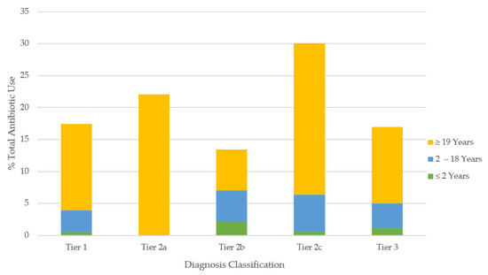 Proportion of all antibiotics prescribed for common infections according to tier classification. Tier 1 = antibiotics always indicated (maximal rate 100%); tier 2a = antibiotics frequently indicated (maximal rate: 51–99%); tier 2b = antibiotics sometimes indicated (maximal rate: 21–50%); tier 2c = antibiotics rarely indicated (maximal rate: 1–20%); tier 3 = antibiotics never indicated (maximal rate: 0%).