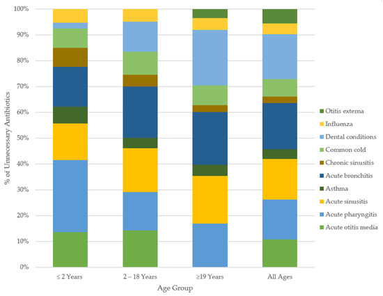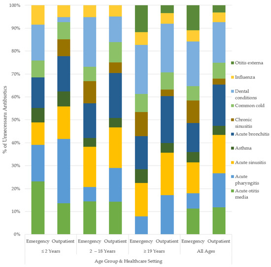 By age groups in outpatient care: patients <2 years of age were the most overprescribed for acute pharyngitis (59%), while bronchitis led overprescribing for those aged 2–18 years, with 49.8% unnecessary. For adult patients (≥19 years), dental infections (56%) received the highest rate of unnecessary antibiotic prescription. The trends by age in emergency care varied from the community prescribing patterns. The patients aged <2 years were overprescribed for AOM at the highest rate (45%), while dental infections (65%) were overprescribed the most in those aged 2–18 years. The highest rate of unnecessary antibiotic use in adults was 76%, for dental conditions. The magnitudes of unnecessary antibiotic use varied across healthcare settings with similar directional trends across indications. Figure 2 and Figure 3 show the breakdown of the percent of unnecessary prescribing for each indication by age category and healthcare setting.