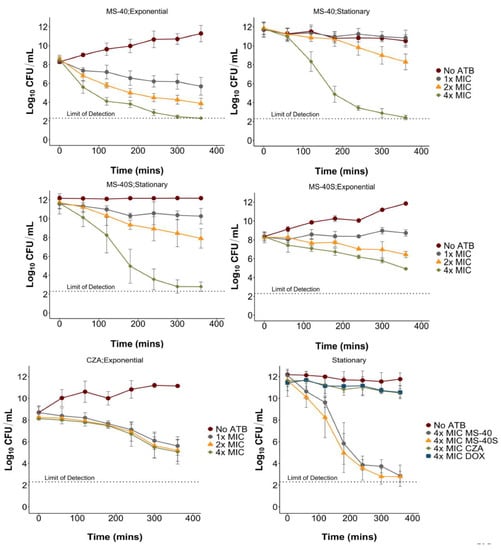 Antibiotics are classified either as bactericidal, if they kill cells and reduce the population by 99.99%, or bacteriostatic, if they prevent cell growth/division, but do not kill more than 99.99% of the population [,]. It is common for antibiotics to only target actively dividing cells because their targets are involved in replication or other energy-dependent processes [], rendering them less effective when cells are not replicating or respiring []. In time kill experiments, we found MS-40S to be bactericidal to both exponential (replicating) and stationary (non-replicating) phase cells, and the same was found for MS-40 (Figure 3; top 4 panels). Interestingly, MS-40S is more effective at killing stationary phase (Figure 3; middle right) than exponential phase cells (Figure 3; middle left), reducing the culture by approximately three log10 units and nine log10 units at 4× MIC in the exponential and stationary phase, respectively. For comparison purposes, we show that doxycycline and ceftazidime–avibactam are both unable to kill cells in stationary phase (Figure 3; bottom right) and ceftazidime–avibactam is slow at killing exponential phase cells, regardless of the concentration (Figure 3; bottom left).