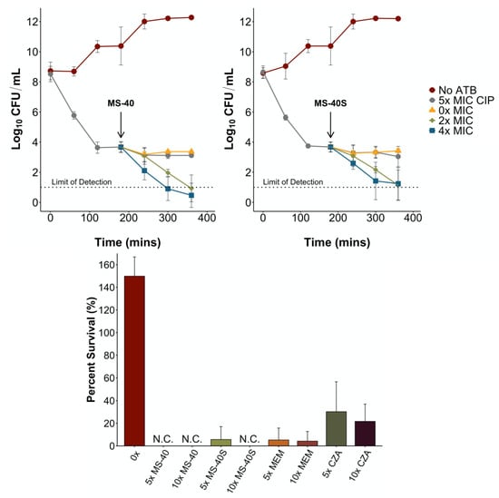 MS-40S kills and inhibits the formation of persister cells. (Top) An exponential phase culture with approximately 1 × 108 CFU/mL was exposed to 5× MIC ciprofloxacin (CIP) to generate persister cells. At three hours post-exposure, persister cells were washed, resuspended in PBS and exposed to 0×, 2×, or 4× MIC of MS-40 (top left) and MS-40S (top right) for an additional three hours. No ATB; no antibiotic. (Bottom) An overnight culture of B. cenocepacia K56-2 was incubated with the corresponding antimicrobial, MS-40, MS-40S, meropenem (MEM), or ceftazidime–avibactam (CZA). Percent survival was calculated by the log10 CFU/mL of the surviving population/log10 CFU/mL of the initial population. N.C., no colonies.