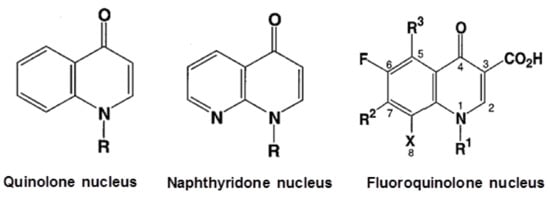 Structures of the quinolone, naphthyridone, and fluoroquinolone nuclei. ‘R’ denotes an alkyl group, ‘X’ denotes a small substituent, such as F, Cl, or CH3O−.