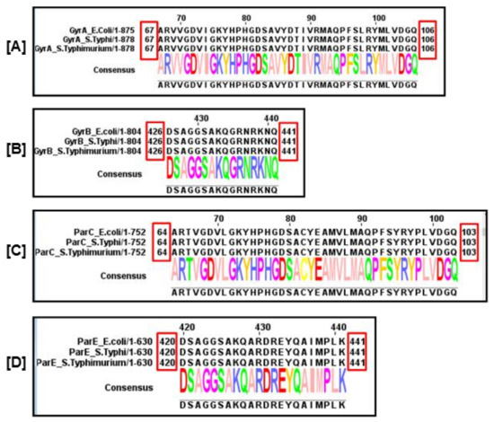 Initially, Yoshida et al. defined the QRDR of GyrA from the alanine (Ala) at position 67 to the glutamine (Gln) at position 106 (numbering for the E. coli protein) [20] (Figure 2A) and that of GyrB from aspartate (Asp) 426 to lysine (Lys) 447 [21] (Figure 2B). Some researchers described the QRDR of Salmonella GyrA to contain amino acids 67 to 122 [22]. The QRDR of ParC encompasses the residues between Ala64 and Gln103 (Figure 2C) and that of ParE those between Asp420 and Lys441 (Figure 2D).
