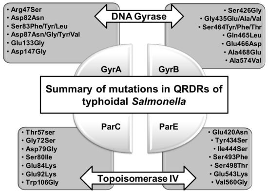 - Walther-Rasmussen, J.; Hoiby, N. Salmonella enterica serovar Typhi and S. Paratyphi A: Need to expand the QRDR region? Epidemiol. Infect. 2011, 139, 1281–1283. [Google Scholar] [CrossRef] [PubMed][Green Version]
